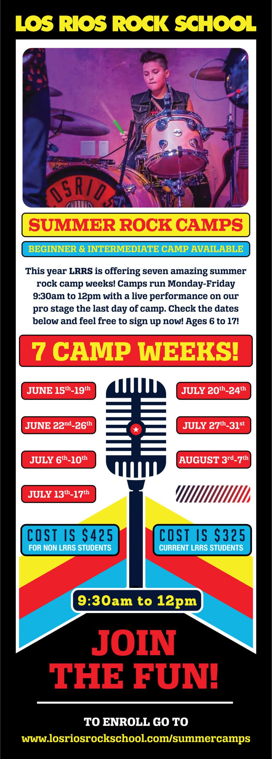On top of the award winning year round program at Los Rios Rock School we also are offering seven Summer Rock Camps this year! Our Summer Camps offer a condensed, week-long version of the Los Rios Rock School program for kids aged 6 to 17.